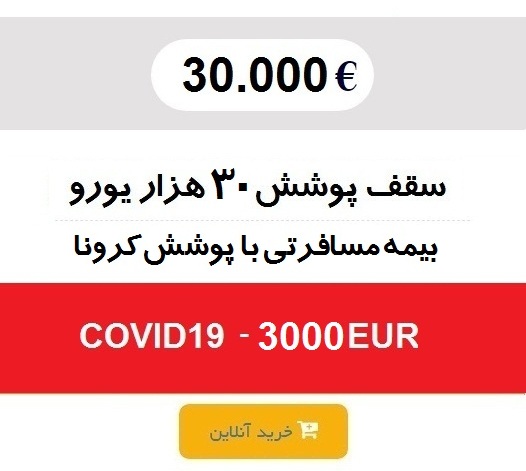 | جبران هزینه های پزشکی ناشی از بیماری کووید19 )کرونا ویروس) در مقصد. برای دریافت این پوشش داشتن کارت واکسن (به شرطی که از از زمان تزریق دوز دوم 2هفته گذشته باشد) و یا انجام تست پی سی آر72ساعت قبل از خروج از کشور یا در بدو ورود در کشور مقصد الزامی است. بدیهی است در صورت مثبت بودن تست قبل از سفر, پوشش فوق خارج از تعهدات بیمه گر می باشد. در صورت نداشتن کارت واکسن معتبر با شرایط اعلامی و یا عدم انجام تست پی سی آر دوره انتظار 14 روزه از زمان خروج از .کشور شامل این پوشش می باشد | 3.000EUR |